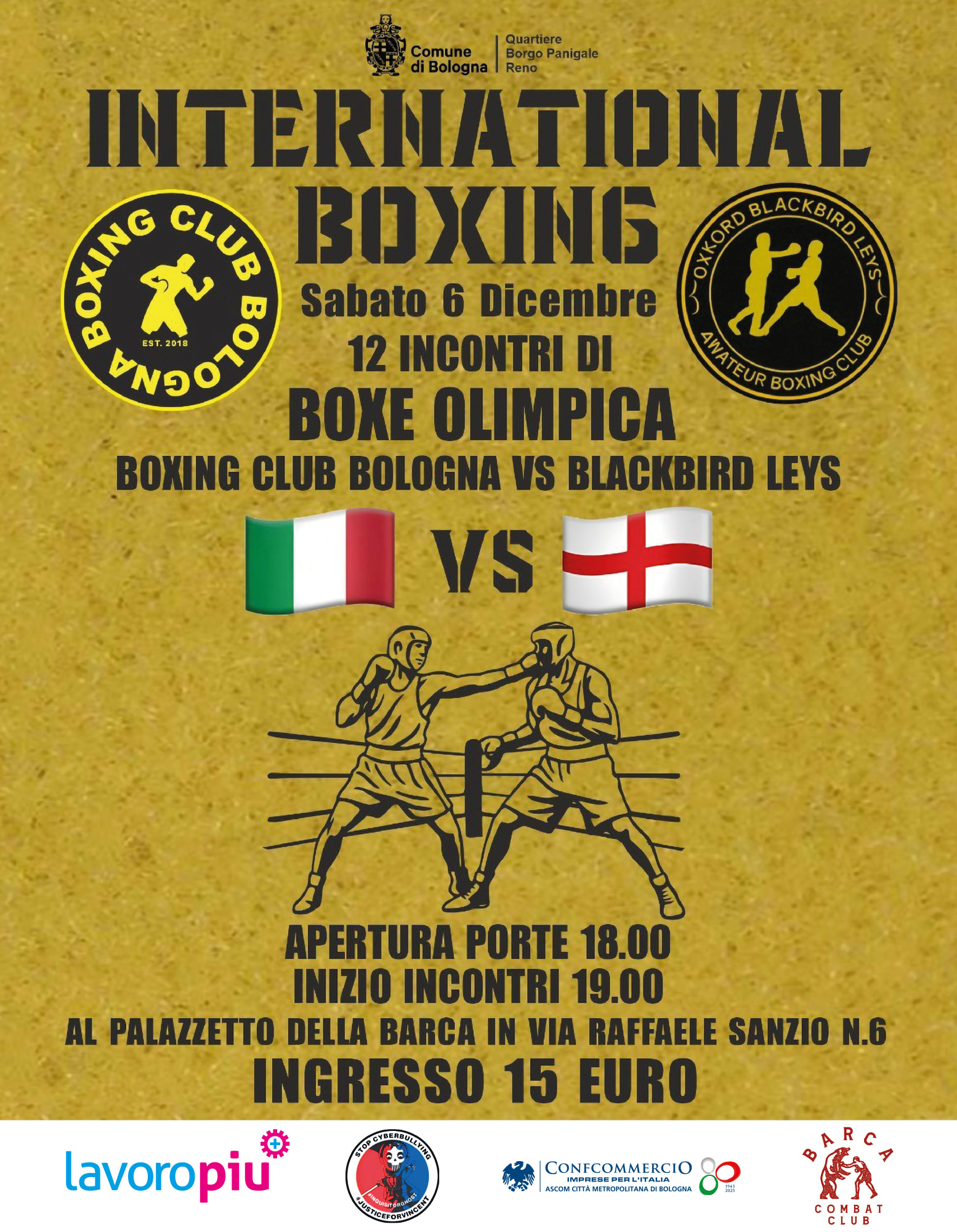 L’evento è organizzato con il supporto del Comune di Bologna – Quartiere Borgo Panigale Reno, in collaborazione con Barca Combat Club, Confcommercio Ascom Bologna, Lavoropiù e la Federazione Pugilistica Italiana, che contribuiscono alla promozione e alla crescita dello sport.