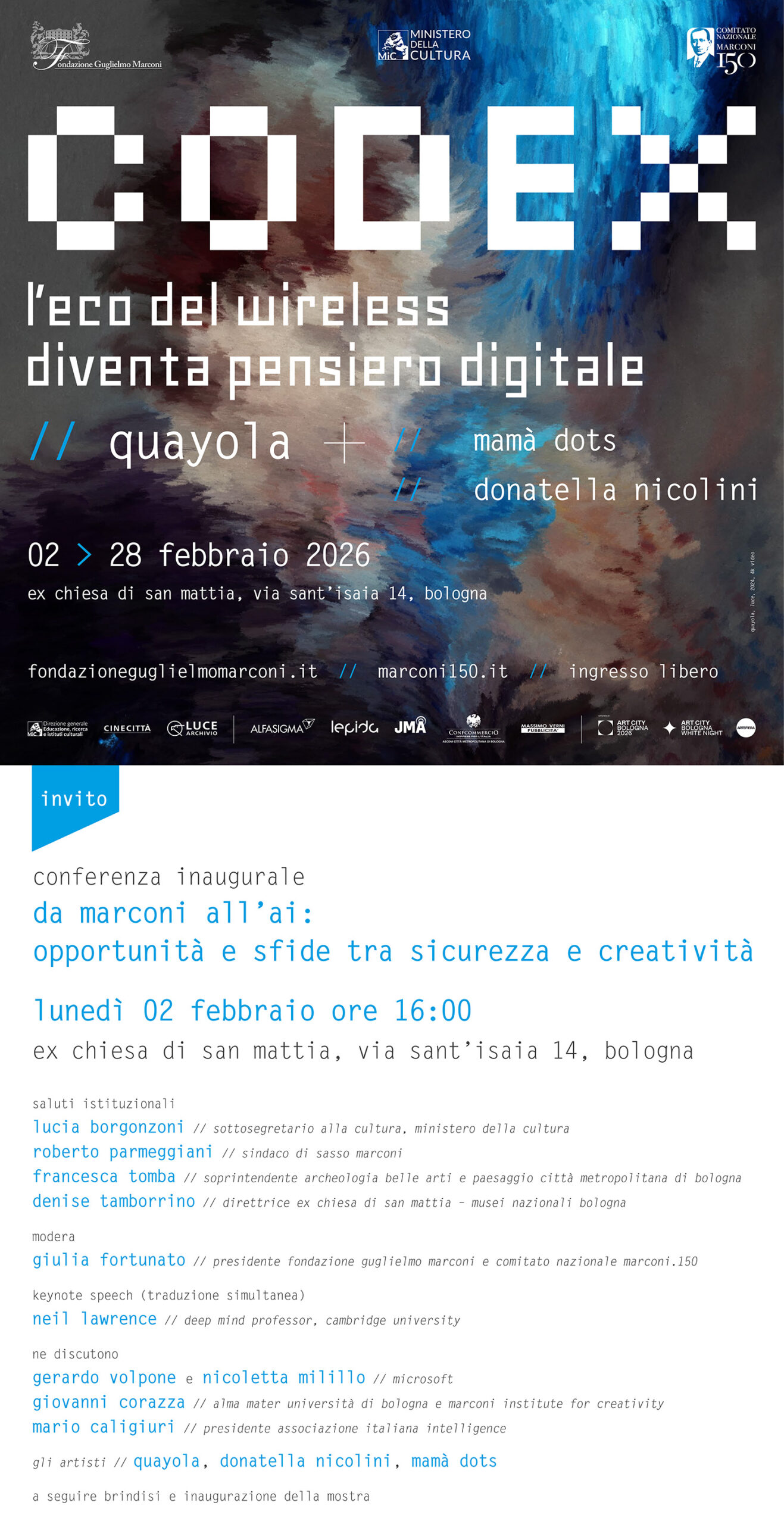 la Fondazione Guglielmo Marconi promuove, nella cornice dell’ex Chiesa di San Mattia in via Sant’Isaia n. 14 a Bologna, la mostra “CODEX – L’eco del wireless diventa pensiero digitale“.