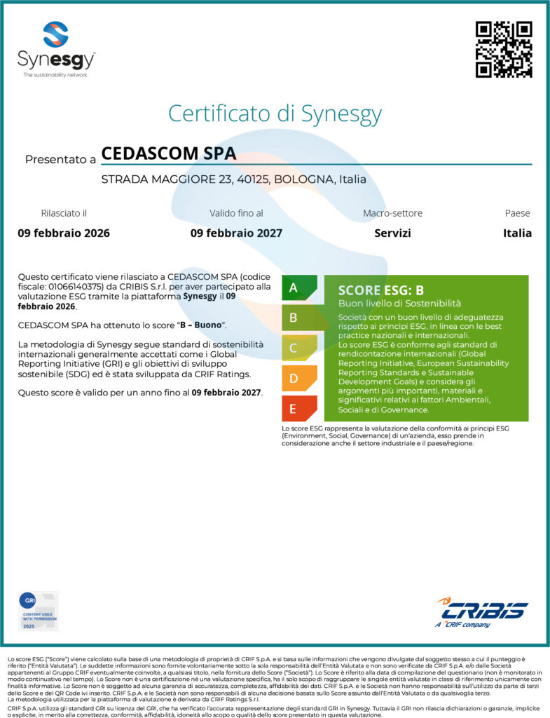 Cedascom SpA, società di servizi di Confcommercio Ascom Bologna, ha ottenuto lo Score ESG “B – Buono” nell’ambito della valutazione realizzata tramite la piattaforma Synesgy del Gruppo CRIF, con validità fino al 9 febbraio 2027.